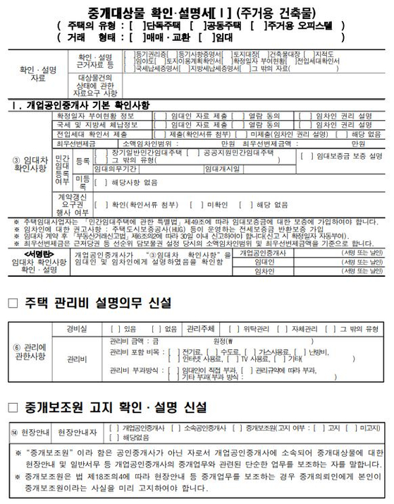 아울러 소형주택 관리비로 묶인 세부 비목(일반관리비·전기료·수도료·가스사용료·TV수신료 등)에 대해서도 중개의뢰인에게 설명해야 한다. 임차 주택을 보여 준 사람이 중개보조원인지 공인중개사인지도 명시해야 한다.