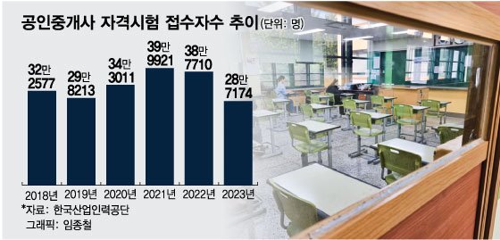 과거 부동산 호황기 공인중개사 시험에 대한 관심도가 높아지며 공인중개사 자격시험 접수자는 2021년 39만9921명으로 역대 최대치를 기록한 이후 매년 줄어들고 있다. 역대급 거래량에 공인중개사가 되면 고수익을 올릴 수 있다는 이야기가 돌며 전연령층에서 시험에 뛰어들었다.