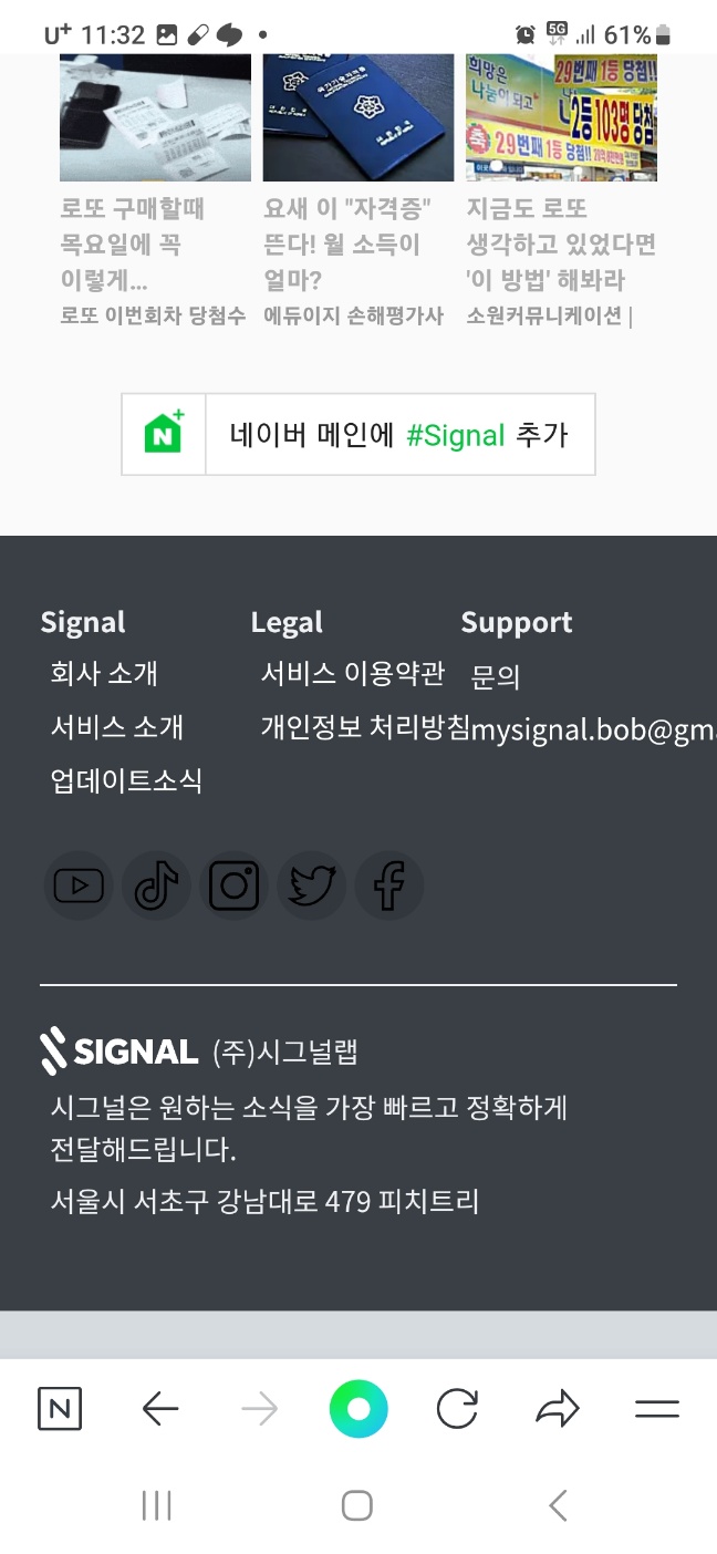 2. 시그널 창이 뜨면 사이트 제일 하단으로 내리고 네이버 메인에 #signal 추가 를 누릅니다.