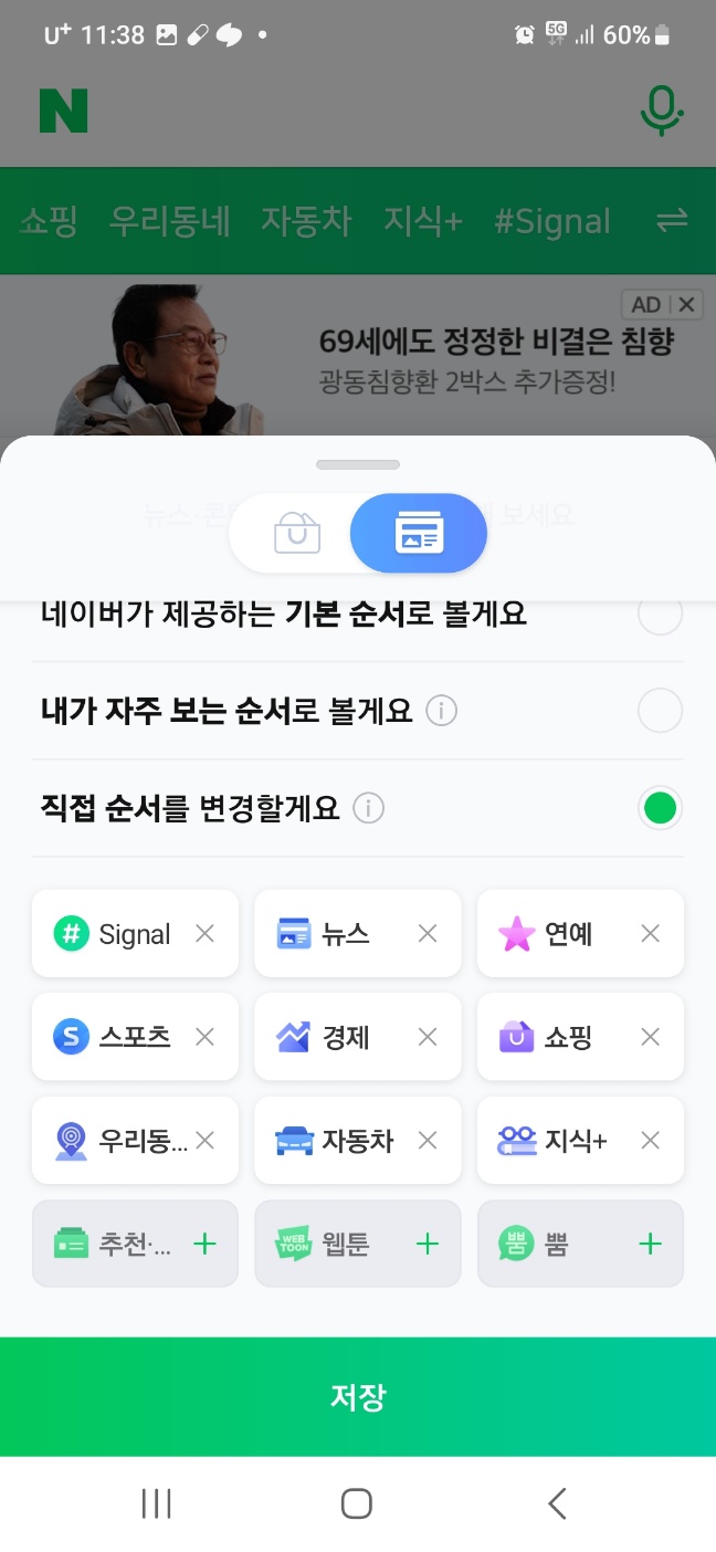 5. 네이버앱에 추가된 시그널을 보실 수 있습니다. 전 순서가 마음에 들지 않아 바꾸려고 합니다.