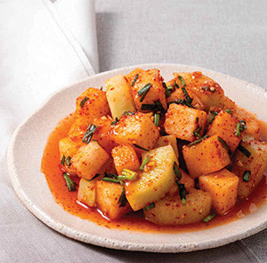깍두기는 깍두기와 고추로 만든 한국의 무 절임의 한 종류이다. 한국 요리의 주요 반찬이고 종종 밥과 다른 요리들과 함께 제공됩니다. 이 요리는 조선시대에 만들어진 것으로 추정되며, 원래는 겨울을 나기 위해 무를 보존하기 위해 만들어졌습니다.