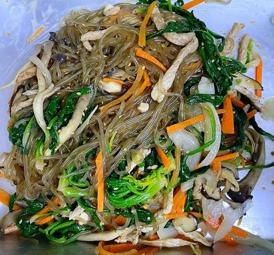 잡채는 당면, 야채, 고기로 만들어지는데 면발이 완벽하게 볶아지고 달콤하고 고소한 맛이 일품인 봄 음식입니다.