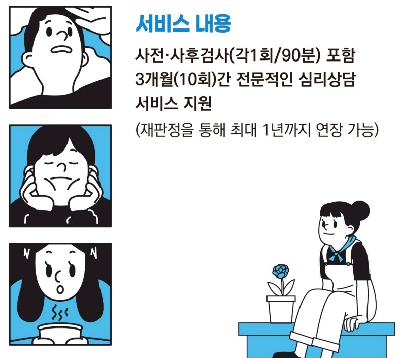 서비스 내용 - 사전. 사후검사 (각 1회 /90분) 포함 3개월(10회) 간 전문적인 심리상담 서비스지원(최대 1년 연장가능)
