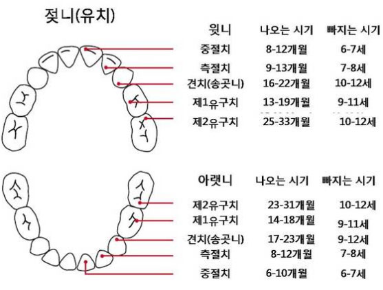 아이들은 치아가 없이 태어납니다. 보통 아래 앞니부터 먼저 나기 시작하고 이후 서서히 옆으로 하나씩 더 나기