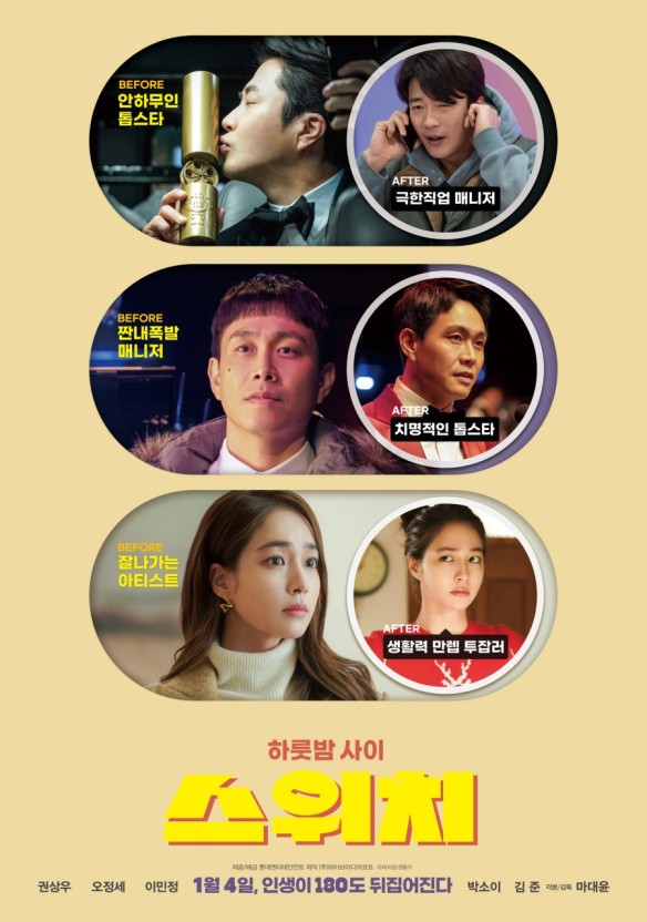 영화 스위치는 내 결정이 바뀌었다면 인생이 어떻게 변해 있을까? 라는 흔히 하는 발상과 그를 소재로  한 영화입니다. 이런 류의 영화가 많이 있었기에 신선함을 느끼기에는 부족했으나 시종일관 유쾌하고 따뜻한 분위기는 영화를 편안하게 보게 합니다. 인생에 있어 정말 중요한 것이 무엇인지, 무엇을 잃고 살아가고 있는지 다시 한번 되뇌는 삶의 활력소를 찾아보게 되는 영화입니다. 소재가 그래서인지 흥행은 아쉬운 수준이었으나 권상우,  오정세, 이민정의 케미와 티키타카가 좋아 볼만했던 킬링타임용 영화입니다. 특히 눈이 예쁜 아역배우 박소이 양과 바가지 머리 김준이 출연해 행복한 가정을 연출한 모습이 너무 사랑스러워 아빠미소를 짓게 하는 영화입니다.