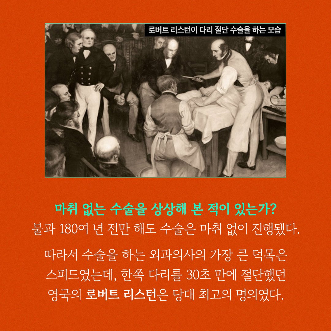 마취제가 없던 시절, 수술은 공포 그 자체였습니다. 1826년 영국의 에든버러 의과대학을 다녔던 의대생 찰스 다윈(영국의 생물학자이자 『종의 기원』을 저술한 사람)은 환자의 비명이 난무하는 끔찍한 수술을 참관한 후 충격을 이기지 못하고 밖으로 뛰쳐나가 돌아오지 않았습니다. 다윈이 목격한 수술 장면은 수술대에 꽁꽁 묶인 소년이 날카로운 수술 도구들로 작은 몸이 쪼개지는 고통을 견디다 못해 기절하는 모습이었는데요. 이는 마취제가 없던 시절에는 흔한 일이었습니다. 당시 수술을 받는 환자들은 상상하기도 힘든 고통을 감내해야만 했고, 생살을 째고 뼈를 깎는 아픔을 견디다 못해 수술 도중에 쇼크사로 사망하는 환자가 많았습니다.