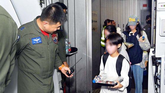 공군 제5공중기동비행단 소속 KC-330 조종사 박종현 소령이 지난 14일 우리 교민들에게 탑승을 안내하고 있다.