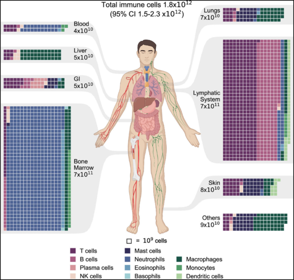 센더 박사 연구팀은 2023년 10월 국제학술지 '미국국립과학원회보(PNAS)'에 발표한 연구에서 인체의 면역세포 분포를 특정하고 그 총수와 총중량을 공개했다. 이에 따르면 평균 체격을 가진 성인 남성의 경우 면역체계는 약 1.8조 개의 세포로 구성되며, 무게는 약 1.2kg으로 추정된다.