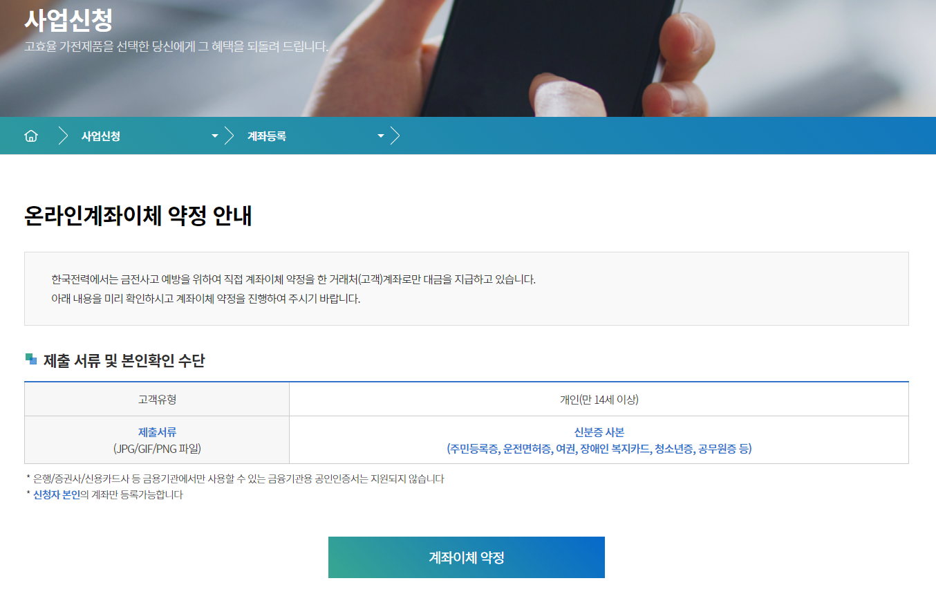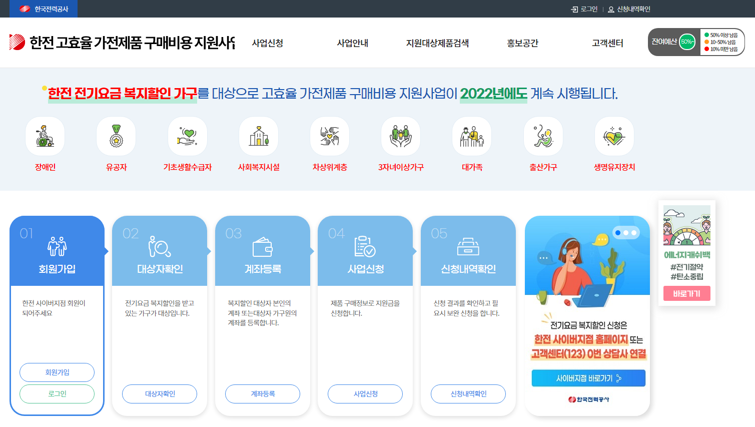 - 지원 사업 신청은 한전 고효율 가전 구매비용 지원사업 메뉴에서 가능