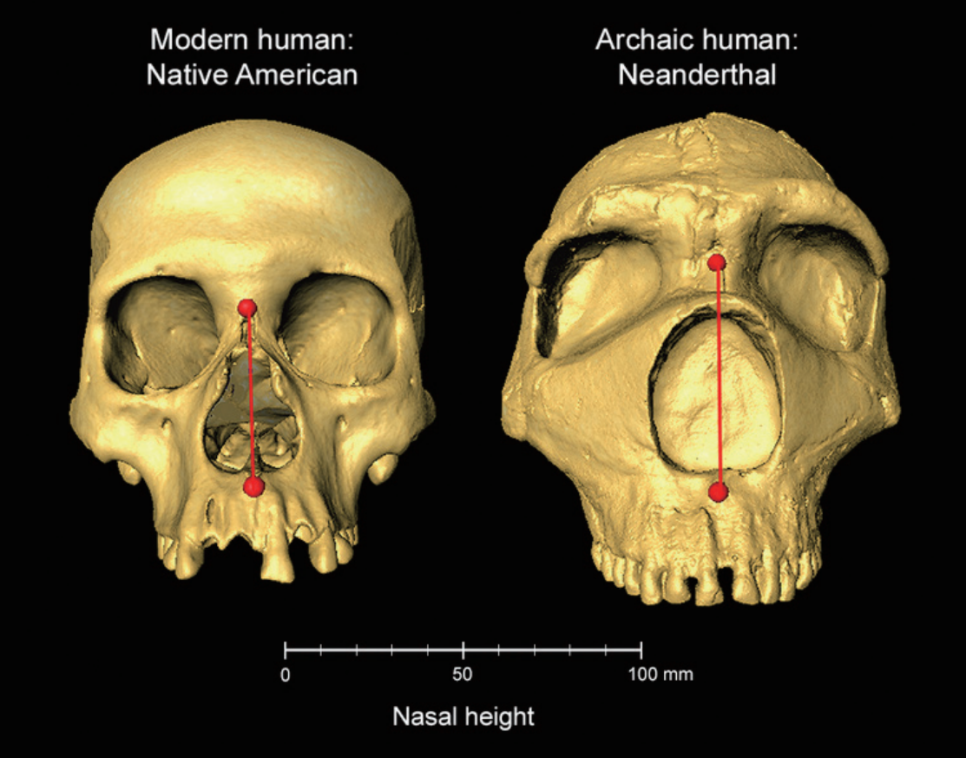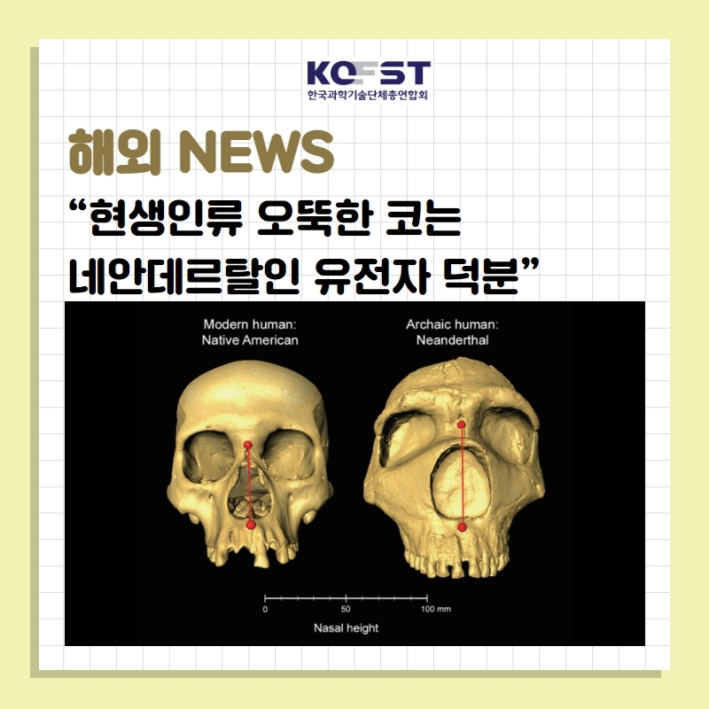 영국 유니버시티칼리지런던(UCL)과 중국 푸단대학교 연구팀은 「커뮤니케이션스 바이올로지」에서 현생인류 호모 사피엔스의 오뚝한 콧날은 네안데르탈인으로부터 물려받은 것으로 보인다고 밝혔다. 카우스튜브 아디카리 UCL 교수는 네안데르 탈인 유전자가 우리 얼굴 형태에 이런 영향을 미친다는 사실을 발견했다며, 이 유전자가 아 프리카를 떠난 호모 사피엔스가 추운 기후에 적응하는 데 유리하게 작용, 자연선택으로 후 손에 전달됐을 것이라고 말했다.