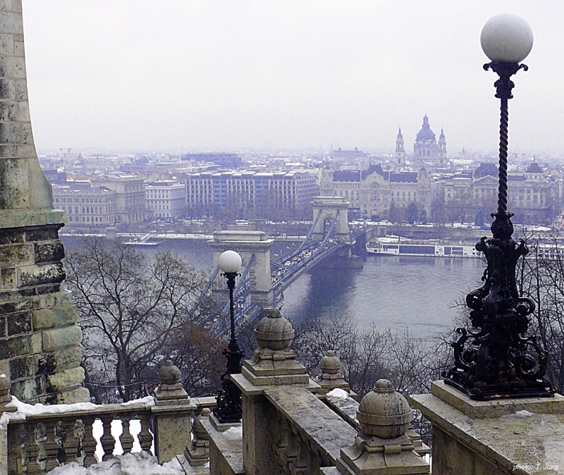 부더(Buda)의 왕궁에서 내려다 본 광경. 도나우 강 건너편 페슈트(Pest) 지역에는 이슈트반 대성당이 랜드마크를 이룬다.