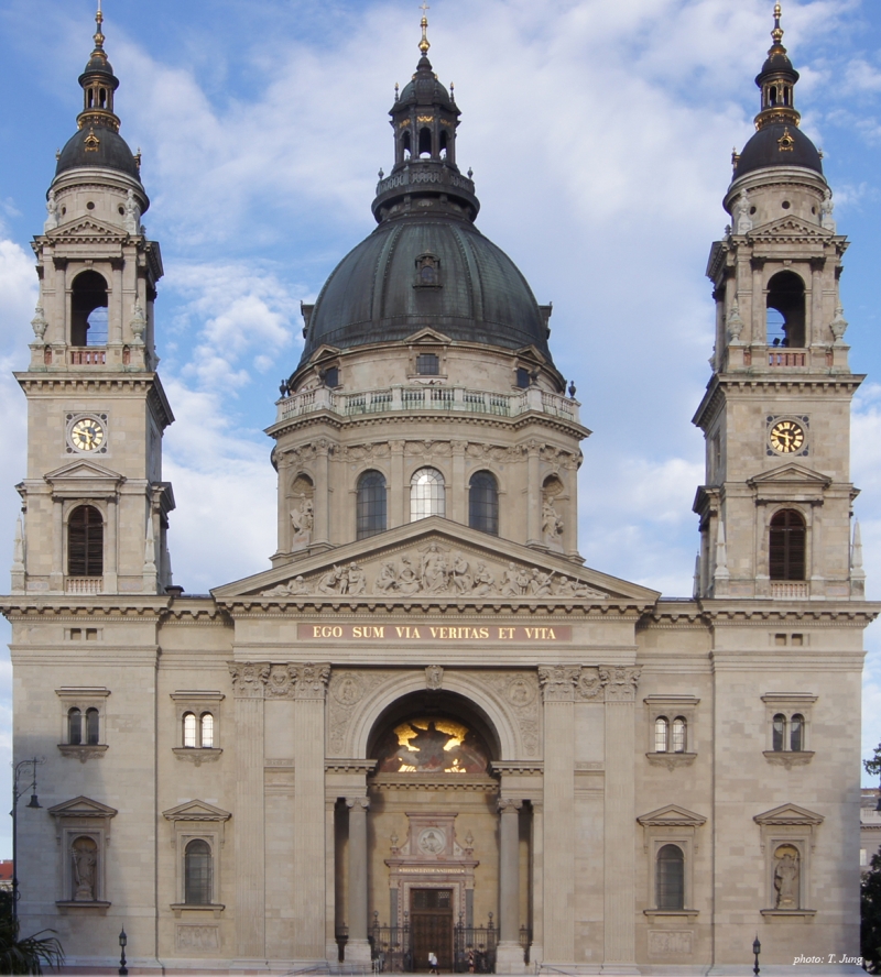 성 이슈트반 대성당의 정면. 라틴어 성경구절 EGO SUM VIA VERITAS ET VITA이 눈부시게 반사된다.