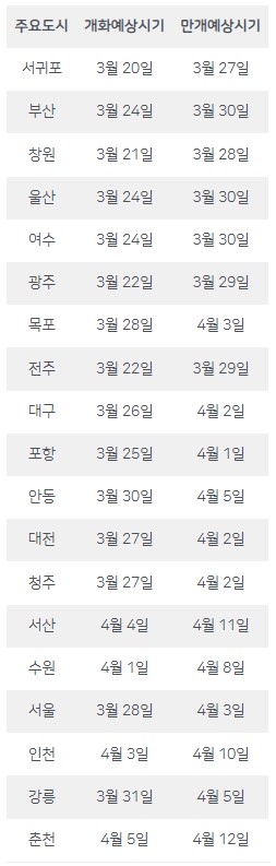 제주가 3월 20일 ~ 24일 개화를 시작해 서울은 3월 28일~4월 1일 사이쯤 개화할 것으로 내다보고 있습니다.