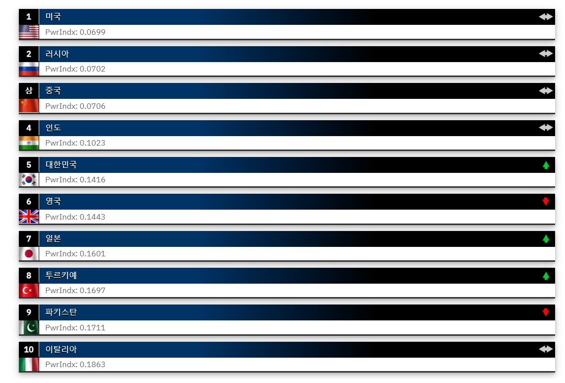 군사력 1위 국가는 미국(0.0699)이었고 러시아(0.0702), 중국(0.0706), 인도(0.1023)가 뒤를 이었다. 6, 7위는 영국(0.1443), 일본(0.1601)이다.