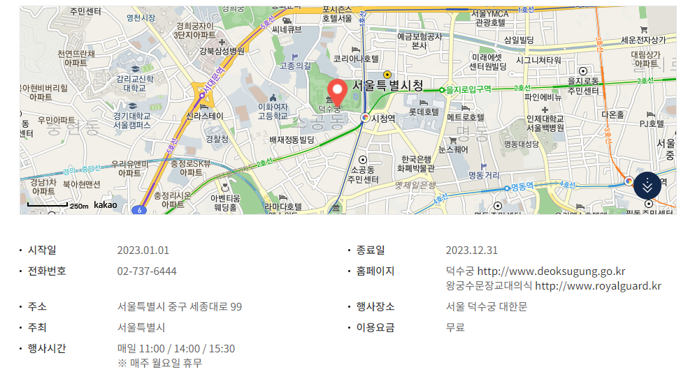 일 년 365일 덕수궁 대한문 앞에서 재현되는 왕궁수문장교대의식은 꼭 관람해볼 만한 볼거리다. 왕궁수문장교대의식의 관람은 무료이며, 매주 월요일과 혹독한 추위와 더위가 있는 날에는 행사를 진행하지 않는다. 왕궁수문장교대의식은 다양한 전통 악기를 앞세운 채 교대조가 등장하면서 시작한다. 그 후 정해진 암호를 상호 간에 알려 아군인지를 확인하는 절차를 마친다. 그 후에는 약 8분간 수위의식, 7분간의 교대의식, 그리고 마지막으로 예를 마치고 순찰을 도는 것으로 의식은 끝이 난다. 6개 관직의 군사 18명이 북을 치며 큰소리로 의식을 진행하는 모습에서는 박진감이 느껴진다.