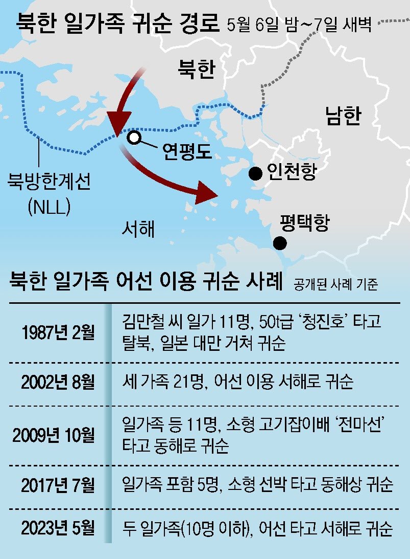 일가족 단위로 어선을 타고 NLL을 넘어 귀순한 사례는 공개된 사례 기준으로 2017년 이후 6년 만이다. 마지막은 2017년 7월로, 당시 북한 주민 5명이 어선을 타고 동해 NLL을 넘어왔는데 이들 중 일부가 일가족이었던 것으로 알려져 있다.