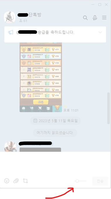 1. 채팅방 우측 아래 투명도 조절 버튼이 있습니다. 좌측으로 옮길수록 투명도가 높아 잘 보이지 않게 되고 우측으로 옮기면 투명도가 낮아 선명하게 보이게 됩니다.