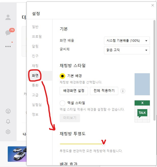 3. 왼쪽 메뉴에서 '화면'을 선택하고 하단의 채팅방 투명도를 조절하세요.