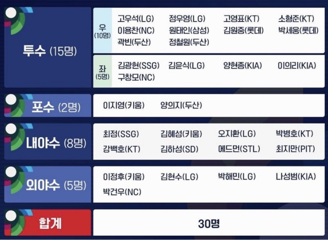 선수단 : 30명 엔트리 명단 (아래)
